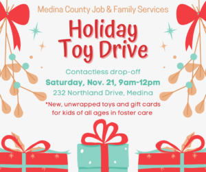 Contact: Layne Hedden Recruiter (330) 635-9165 laynefosteradopt@gmail.com Medina County Job and Family Services Holding Holiday Toy Drive Medina County Job and Family Services is holding a holiday toy drive to collect toys for children in foster care. We are accepting new, unwrapped toys for children of all ages. We are also accepting gift…